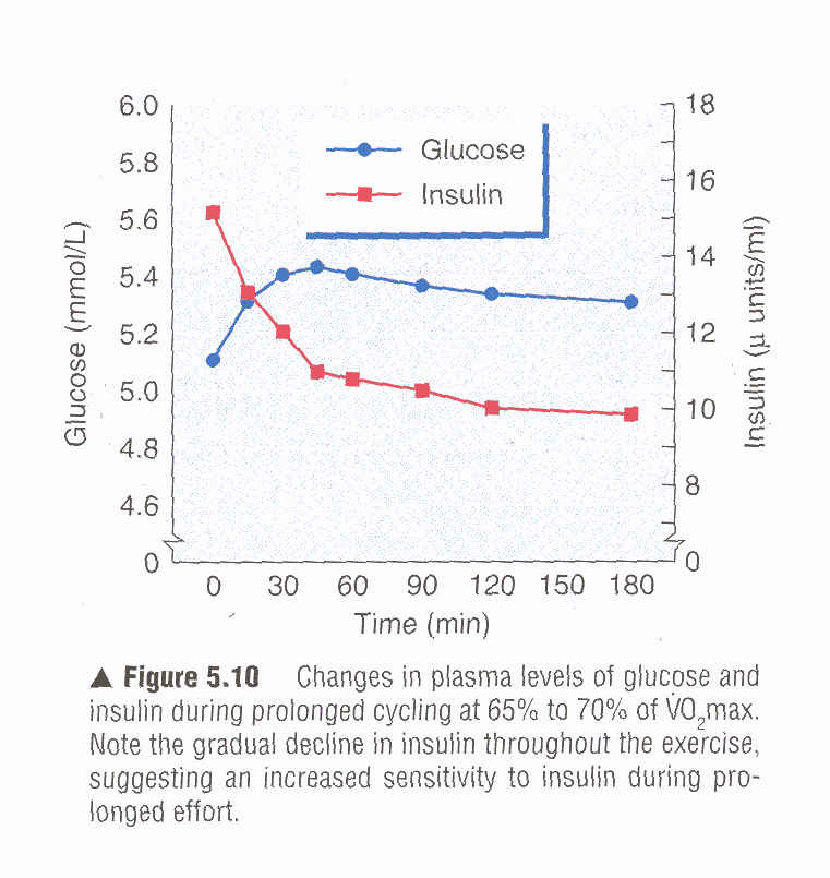 The figure below, from the excellent book by Wilmore and colleagues (2007), shows the variation of blood insulin and glucose in response to an endurance exercise session. The exercise session’s intensity was at 65 to 70 percent of the individuals’ maximal capacity (i.e., their VO2 max). The session lasted 180 minutes, or 3 hours. The full reference to the book by Wilmore and colleagues is at the end of this post.