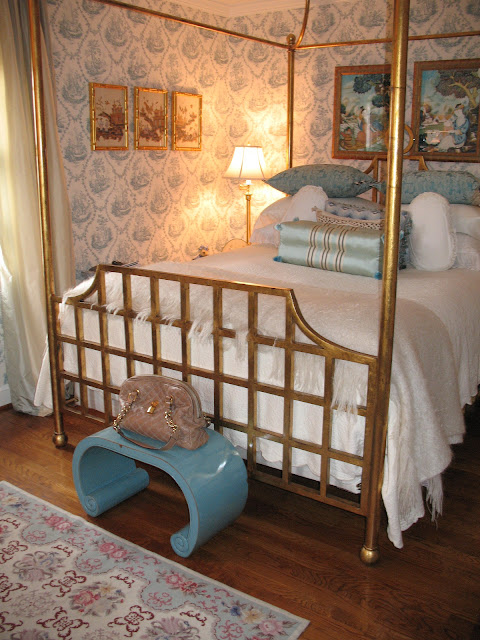 This is my Pagoda Bedroom. The color scheme is pale blue, ivory, silver, and gold. The centerpiece is of course the gold leaf pagoda canopy bed. My main tip for the bedroom is to put your $$ into the bed. I personally love canopy beds. Buy a great mattress. I recently purchased the Heavenly Bed and it really is heavenly. I have outfitted it with goose down pillows and duvet, Frette and Pratesi sheets, the whole nine yards. And if you have high thread count cottons sheets, do yourself a favor and have them professionally laundered and pressed. Such a time saver and you won't believe the difference. Here are some other details -